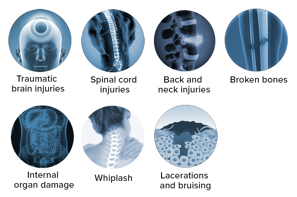 Motor vehicle accidents can lead to many types of injuries, varying in severity from very minor to life-threatening. Some of the most common injuries after a car accident include: